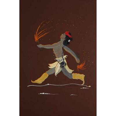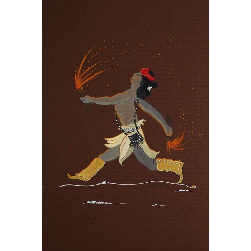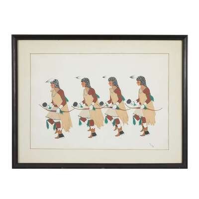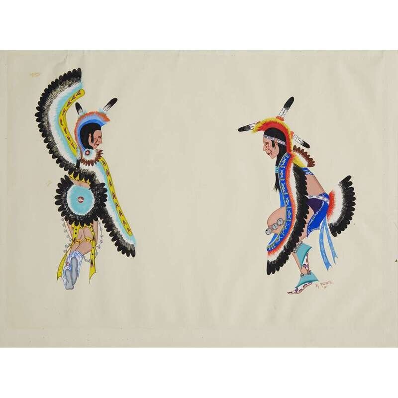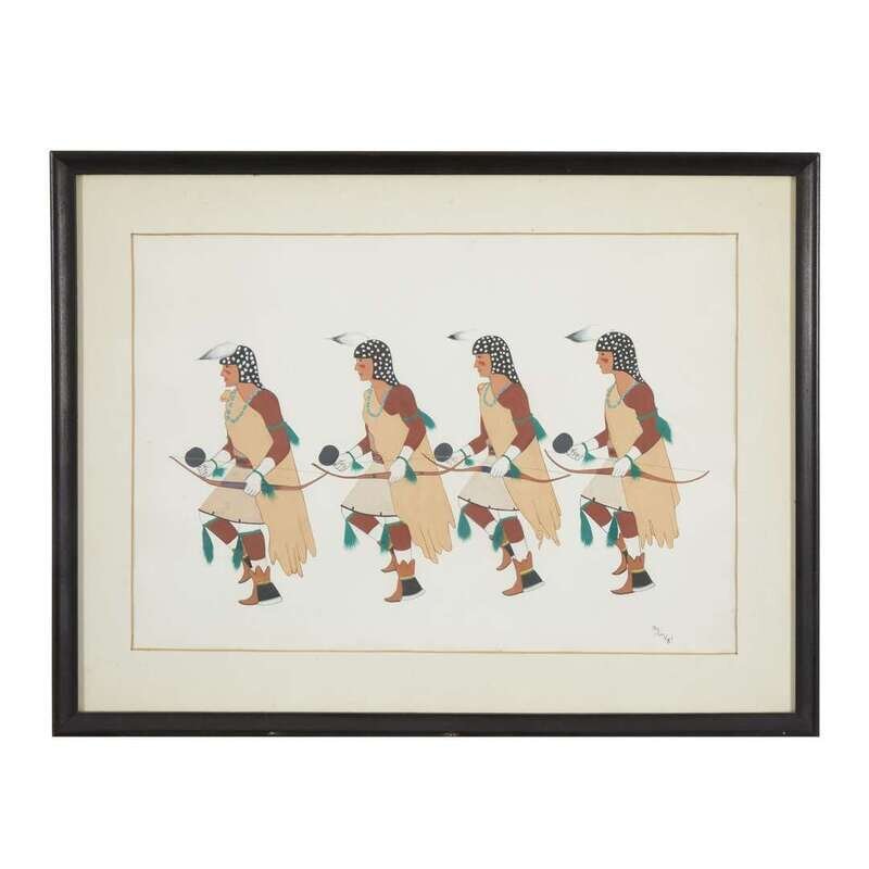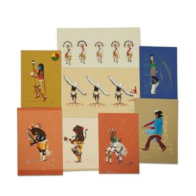Including seven works, each depicting a dancer, all signed, lower right, "Nez-Nah"; others signed, "Ortiz," "Vincent L 52," "C Thomas 70" and "Tim Vigil," two framed.