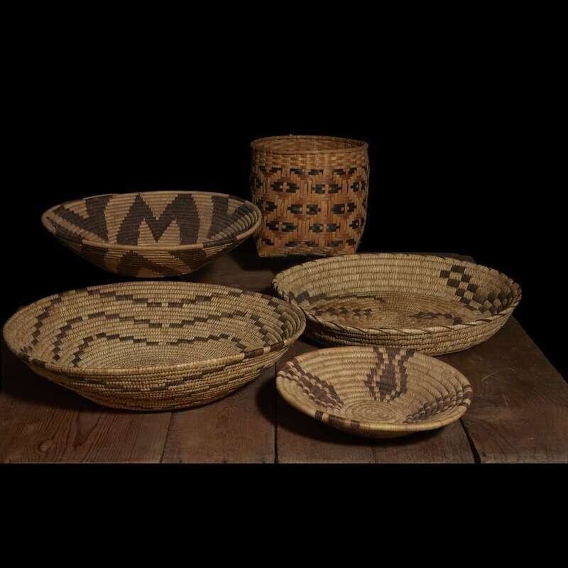Including two Papago (Tohono O'odham) figural snake baskets; together with a North Carolina Cherokee basket by Carol Welch (b. 1940).