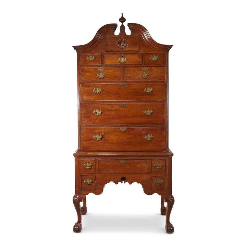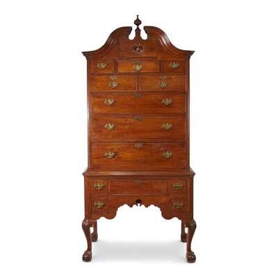 With broken cornice, fitted with drawers, on base with shell-carved knees on cabriole legs ending in ball and claw feet.
