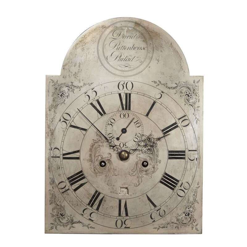 The silvered steel, single-sheet dial with Rococo engraving attributed to James Smither, English (active Philadelphia, 1741-1797), the face inscribed, "David Rittenhouse Philada," with eight-day works; the case twice branded, "I. Parrish."