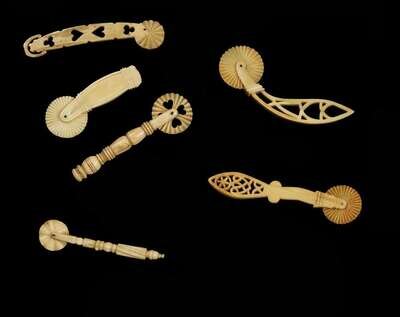 Six whale ivory pie crimpers, a whale ivory silk thread winder, and model of the ship Jessie 19th century