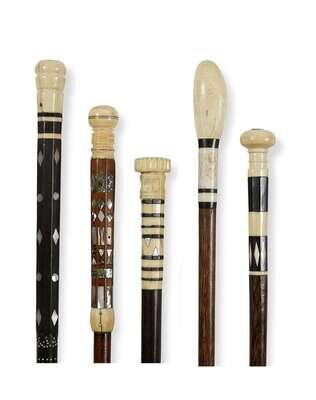 Group of five whale ivory, baleen and exotic wood walking sticks 19th century