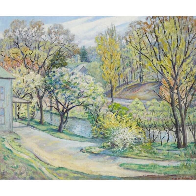 ELIZABETH FISHER WASHINGTON (AMERICAN 1871-1953) "SPRING, VILLAGE BY THE CREEK"