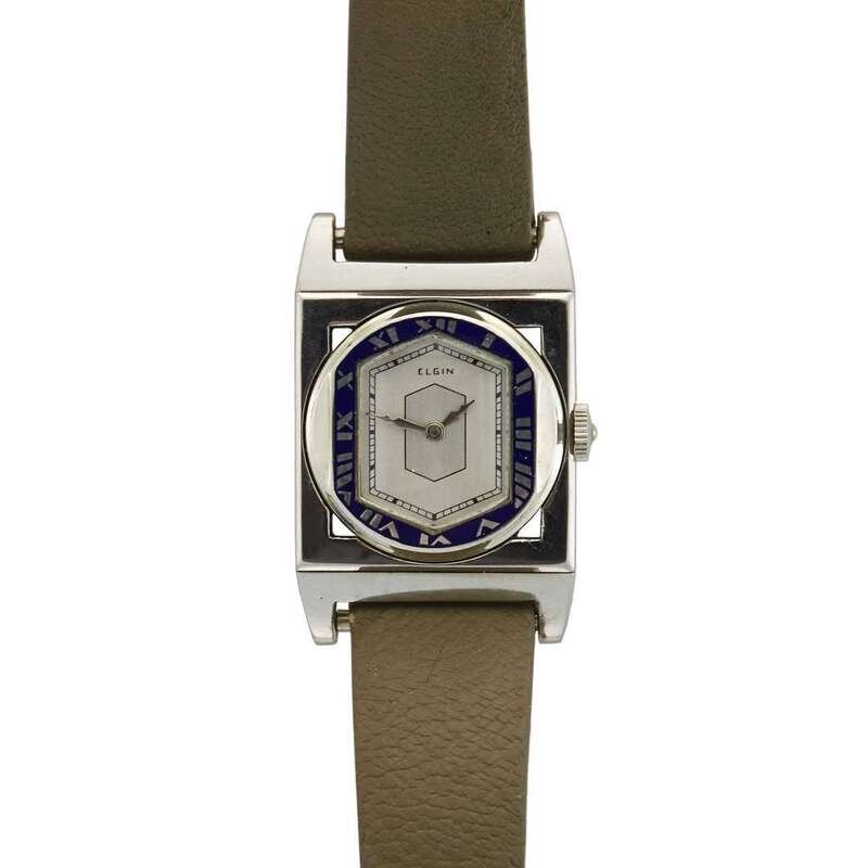 15 jewel movement no. 31277760, screw set split bi-metallic balance, 14k white gold case no. 7496, circular case with hexagonal dial, blue enamel bezel with Roman numerals within a rectangular frame. Dial, strap and movement signed for Elgin.