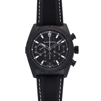 Automatic watch, features a black PVD coated ceramic case surrounding a black dial on a black leather strap with a PVD coated ceramic deployment buckle. Functions include hours, minutes, small seconds, date, chronograph and tachymeter. This watch comes complete with box and papers.