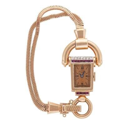 Paul Ditisheim Retro Diamond, Ruby & 14 Karat Rose Gold Ladies Watch c. 1945