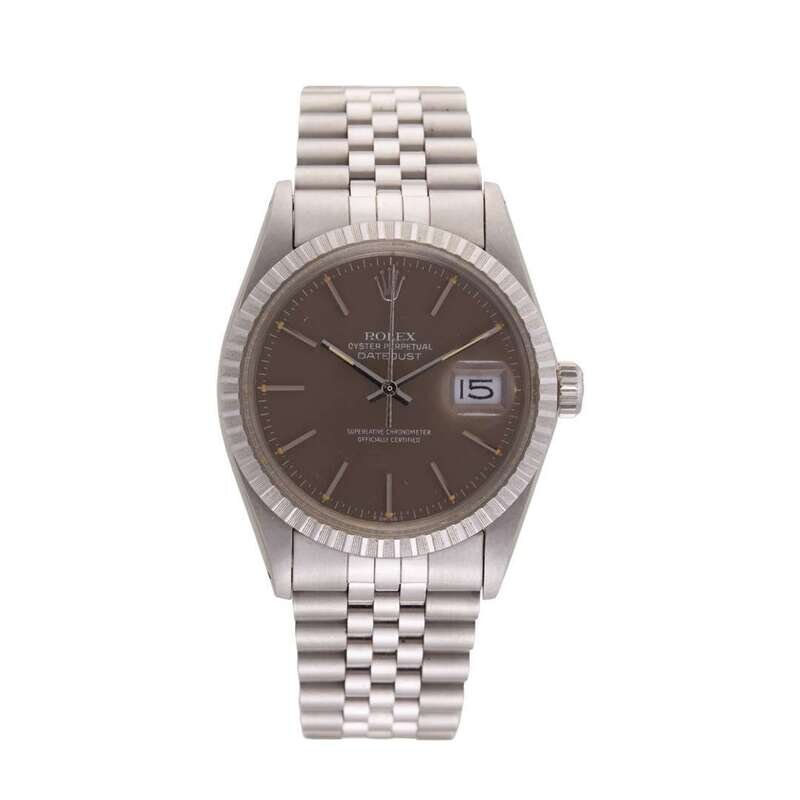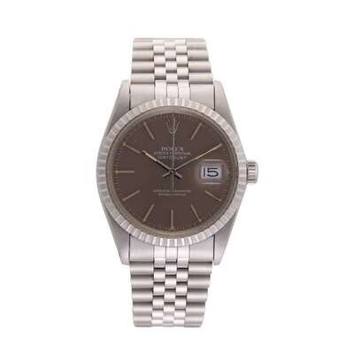 Automatic watch, features a stainless steel case surrounding a grey dial on a stainless steel Jubilee bracelet with a stainless steel folding buckle. Functions include hours, minutes, seconds and date.