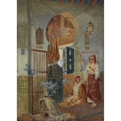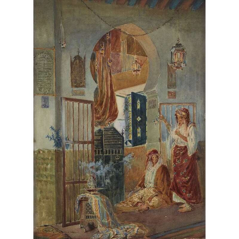 PAOLO SIMONI (ITALIAN 1882-1960) SEATED WOMAN WITH ATTENDANT BY A DOORWAY