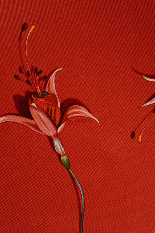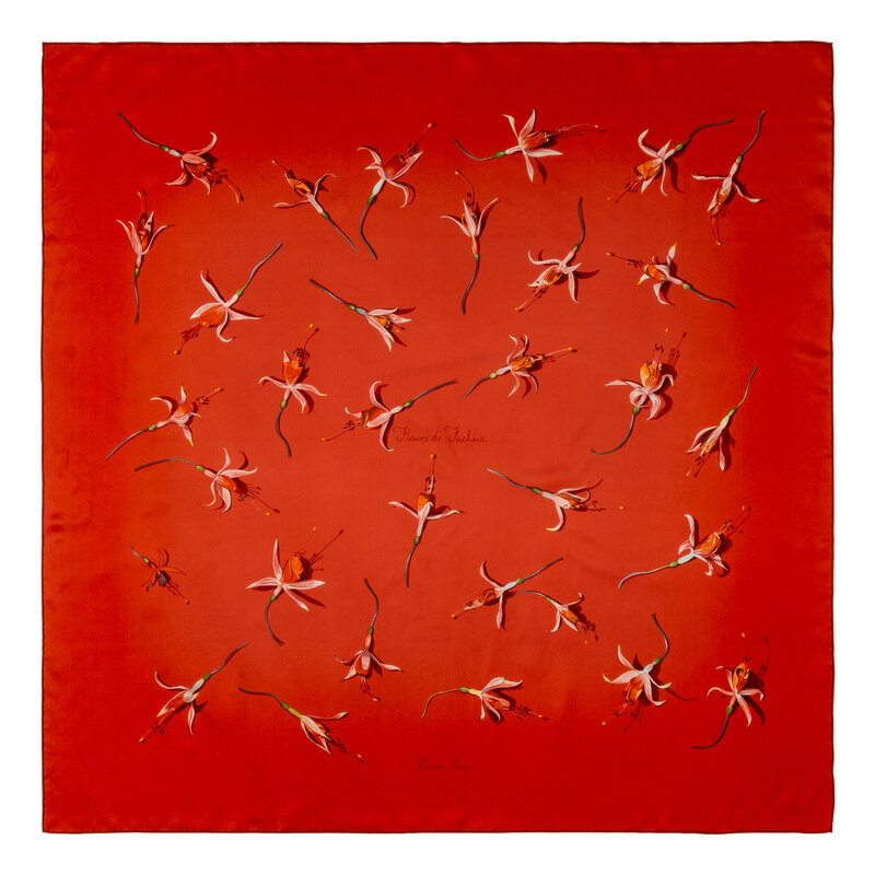 "Fleurs de Fuchsia" Scarf 90 in Printed Silk Twill with Rolled and Hand-Stitched Edges.