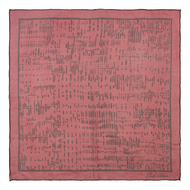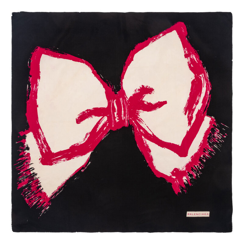 Square silk scarf in printed silk with bow motif. Raw edges.