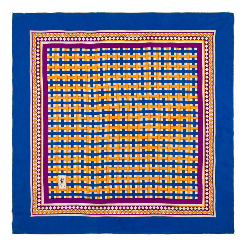 Square scarf in geometric motif printed silk with rolled and hand-stitched edges.
