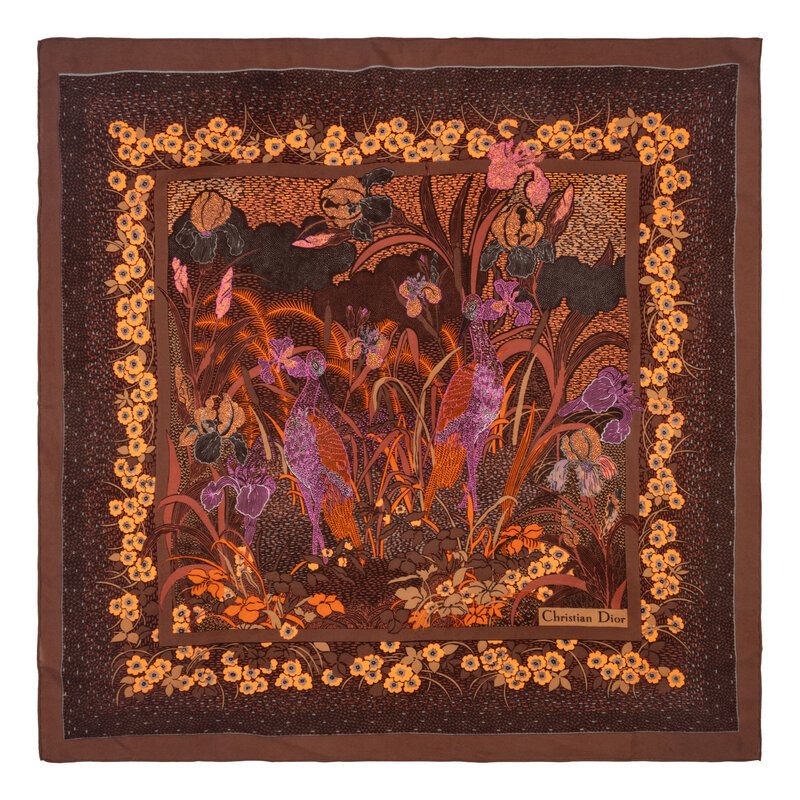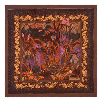 Square handkerchief/scarf in printed silk chiffon. Rolled and hand-stitched edges.