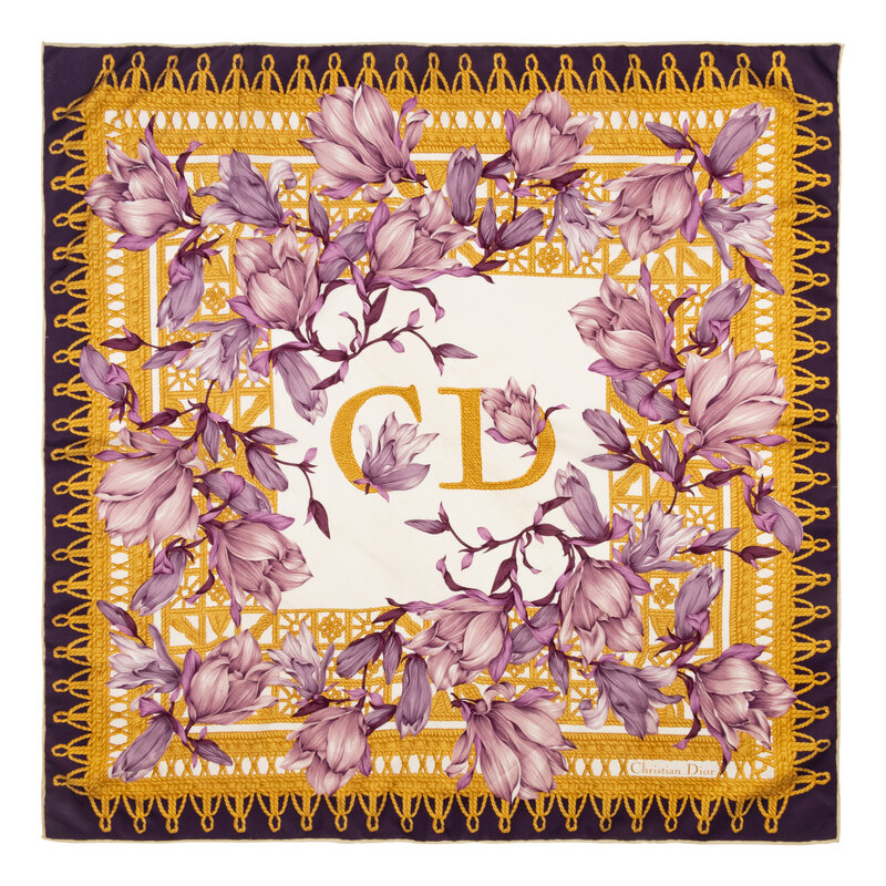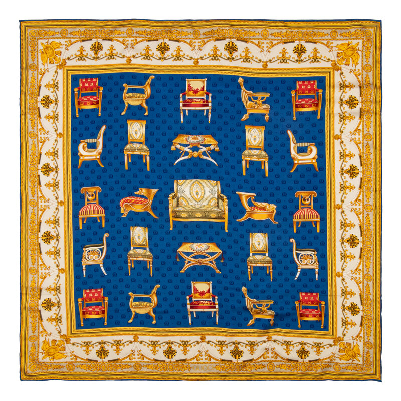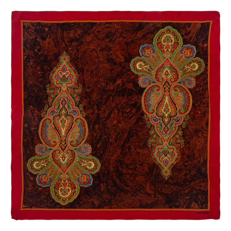 Square scarf in printed silk twill with baroque-style motifs. Rolled and hand-stitched edges.