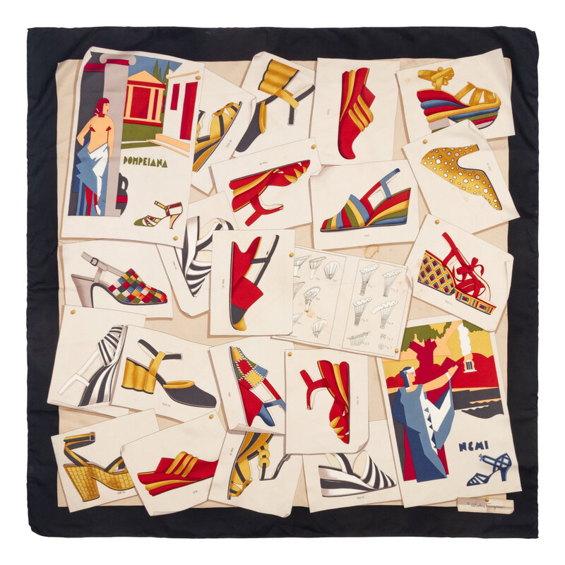 Square scarf in printed silk twill with shoe design motifs. Rolled and hand-stitched edges.