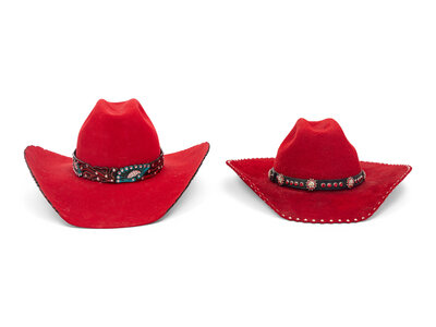 Western-style cowboy hat in red felt with hand-painted/etched and rhinestone-embellished overlays.