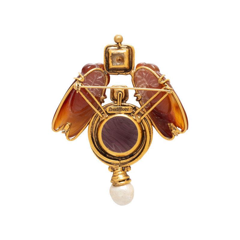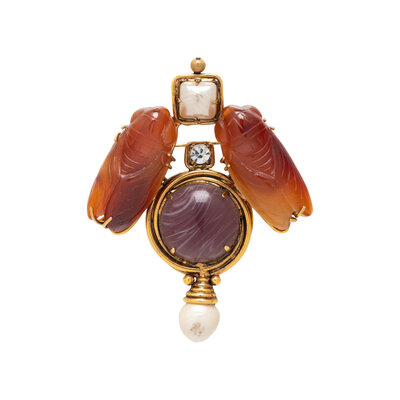 Purple cabochon accented by glass pearls and colorless crystal and surmounted by carved cicadas. 3 1/2 x 2 3/4 inches.