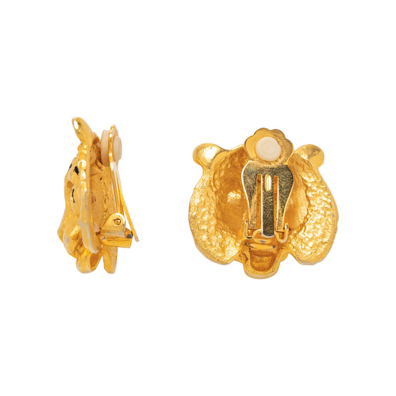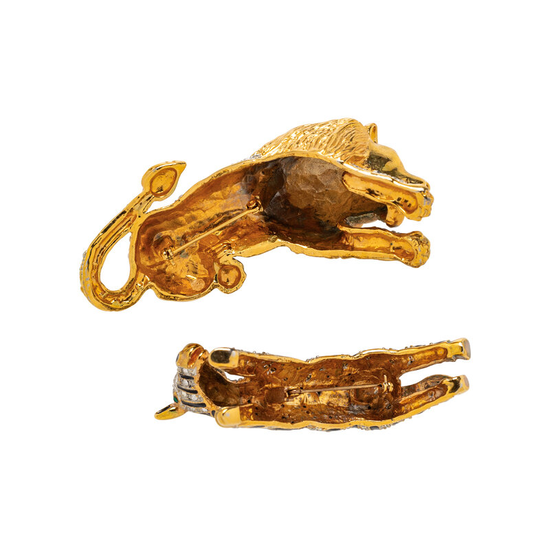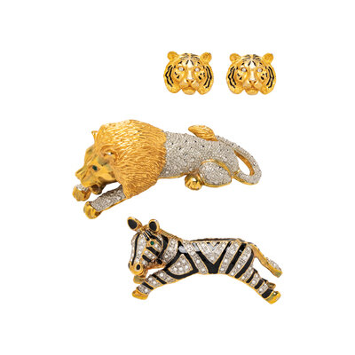 Including a lion pin, zebra pin, and a pair of tiger clip earrings. Lion: 4 1/8 x 1 1/4 x 1 1/2 inches. Zebra: 3 1/4 x 1 inch x 1 3/4 inches. Earrings: 1 x 1 1/8 inch.