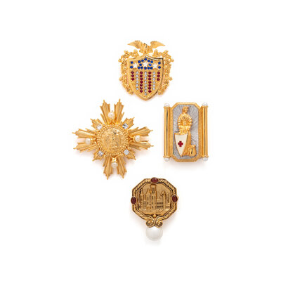 Pins include Ann Hand 'Shield of Courage', Maltese cross shape 'America Pin', 'Red Cross' pin, and a Washington National Cathedral pin. 2 x 1 7/8 inches, 2 5/8 x 2 5/8 inches, 1 7/8 x 1 1/2 inches, 2 x 1 1/2 inches.