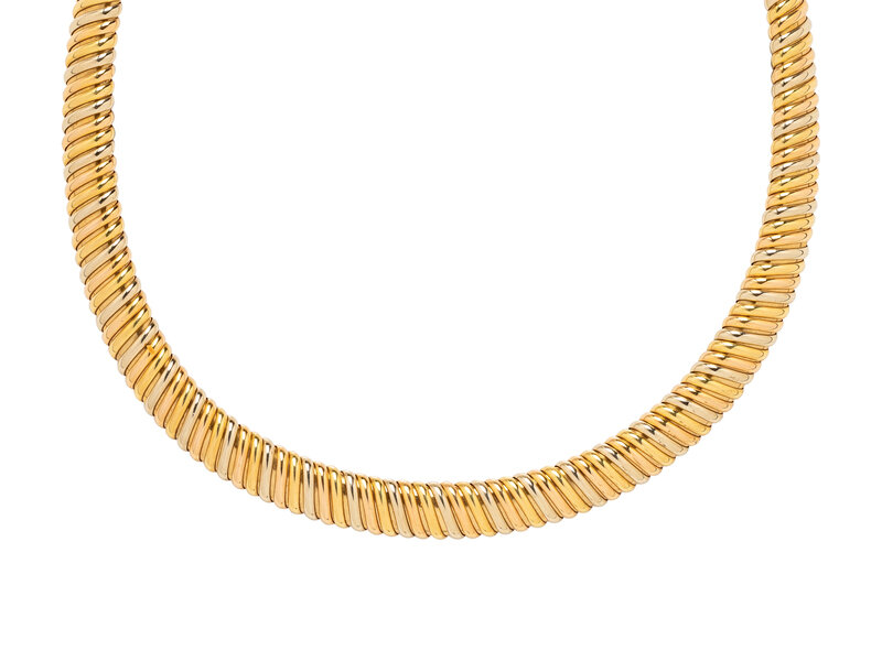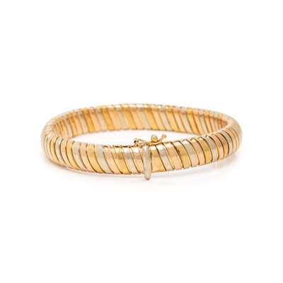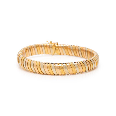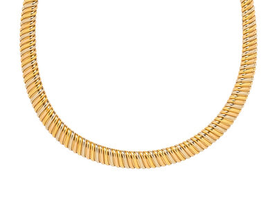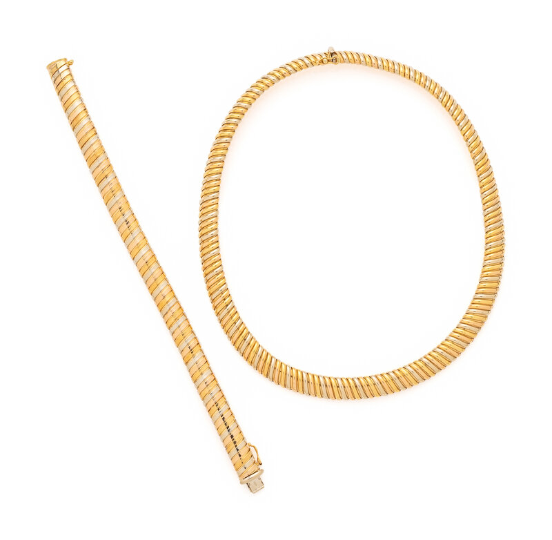 Highly flexible links measuring approximately 10.00 mm wide. 18 karat white and yellow gold. Necklace: 16 3/4 inches long. Bracelet: 7 3/4 inches long.