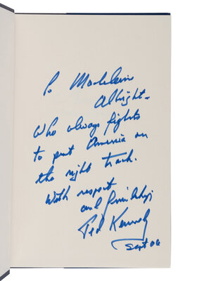 Inscribed: “To Madeleine Albright, who always fights to put America on the right track. With respect and friendship, Ted Kennedy Sept 06.” Secretary Albright enjoyed a warm friendship with Senator Kennedy, remarking at the JFK Presidential Library a month after his passing that “he is somebody who had a very large heart and a sense of watching over other people and caring about their well being.”