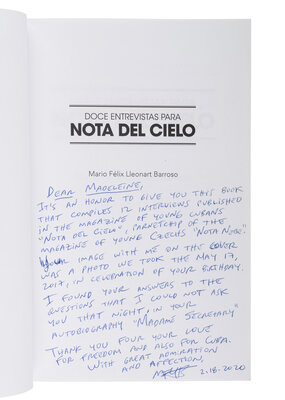 Inscribed on the half-title: "Dear Madeleine, It's an honor to give you this book that compiles 12 interviews published in the magazine of young Cubans 'Nota del Cielo,' partnership of the magazine of young Czechs 'Nota Nebe.' Your image with me on the cover was a photo we took the May 17, 2017, in celebration of your birthday. I found your answers to the questions that I could not ask you that night in your autobiography 'Madame Secretary.' Thank you for your love for freedom and also for Cuba. With great admiration and affection, MFLB 2.18.2020." Additionally inscribed on the title-page with the author's contact information. Barroso and Secretary Albright met at the Czech Republic Embassy in Washington, D.C. during the tribute held in her honor on her 80th birthday.