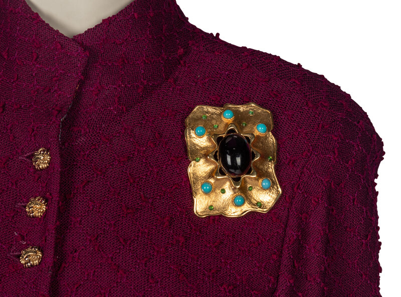 Gold-tone metal brooch with multicolor cabochon embellishments.