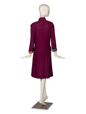 Single-breasted jacket in lilac cotton-blend knit with decorative buttons at center front and fringed edges. Unlined with false patch pockets at front hips.