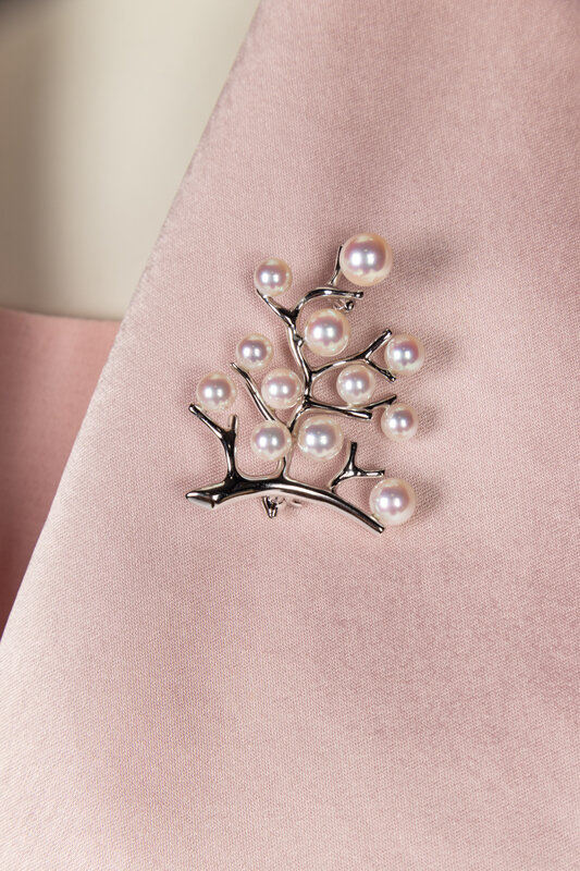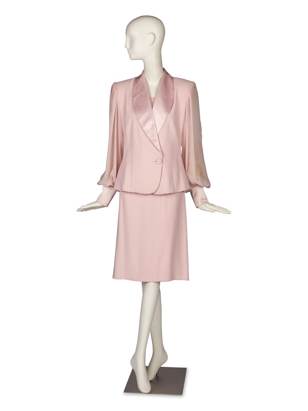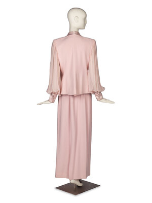 Double-breasted jacket in pink crepe with chiffon sleeves and shawl collar.