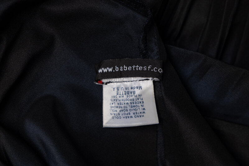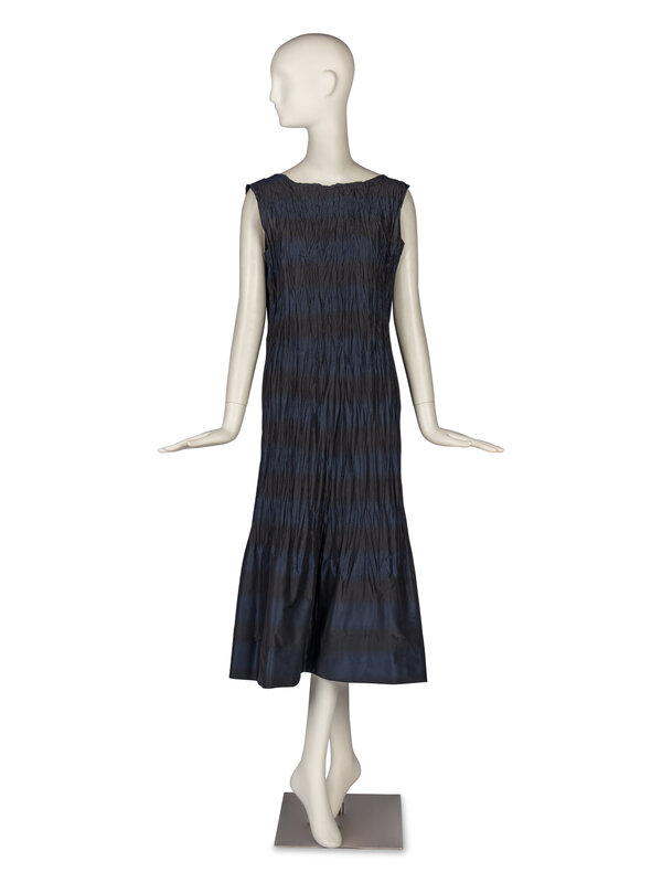 Sleeveless, flared dress in blue/black pleated polyester. Unlined.