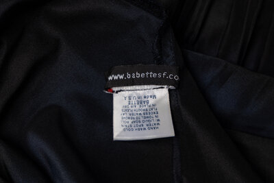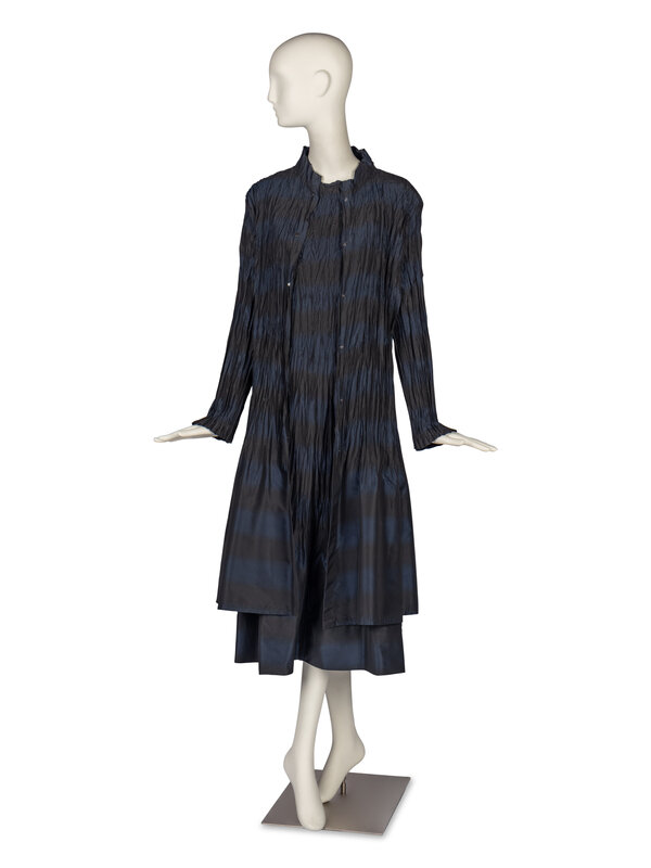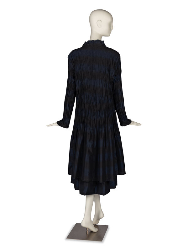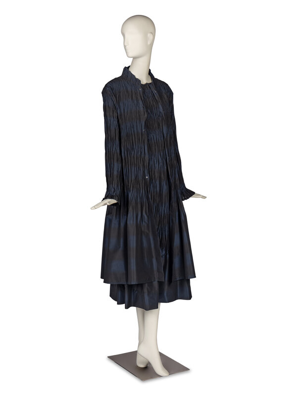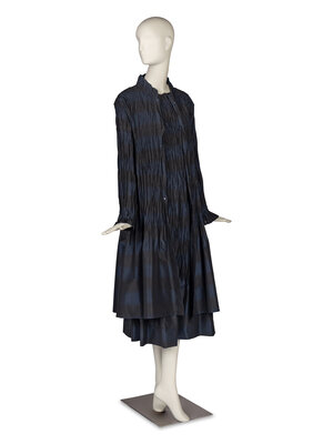 Long jacket in blue/black pleated polyester. Jacket is unlined, with a snap-closure at front, and stand collar.