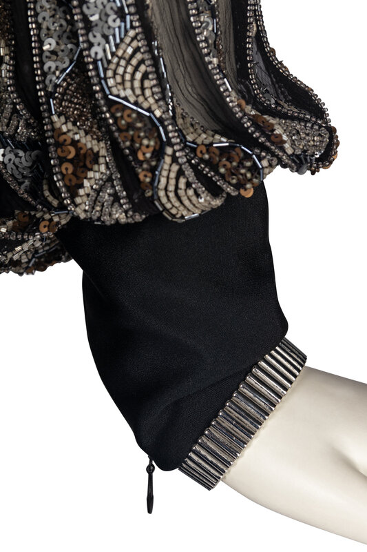 Longsleeve dress in black silk-blend micro faille with sequin-embellished, semi-transparent chiffon sleeves. Dress is fully-lined with zipper at center back seam.