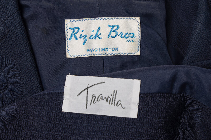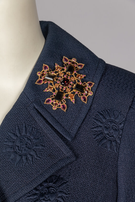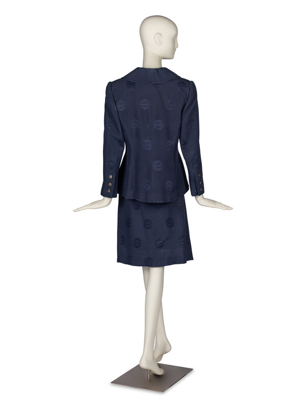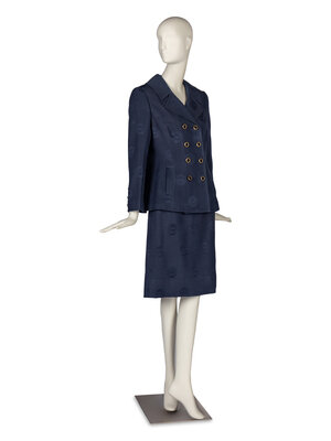 Double-breasted, notch-collar jacket in navy blue jacquard crepe. Fully-line with decorative buttons at front/cuffs with slash pockets at hips.