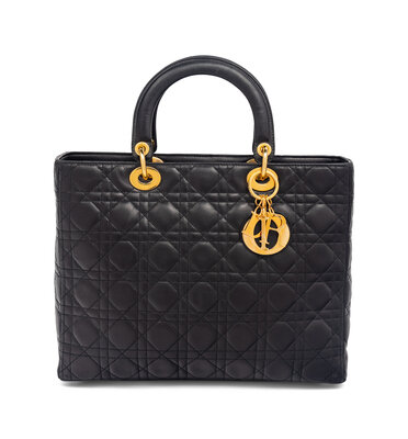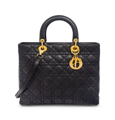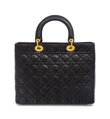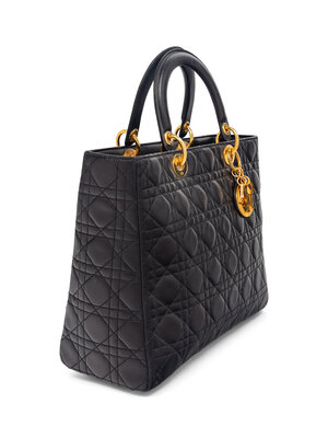 Christian Dior Lady Dior Handbag in Quilted Black Cannage Lambskin Leather with Gold-Tone Hardware.