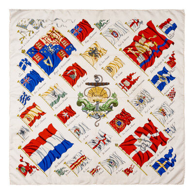 "Pavois" Scarf 90 in Printed Silk Twill with Rolled and Hand-Stitched Edges.