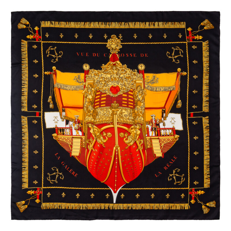 "Vue du Carrosse de la Galere la Reale" Scarf 90 in Printed Silk Twill with Rolled and Hand-Stitched Edges.