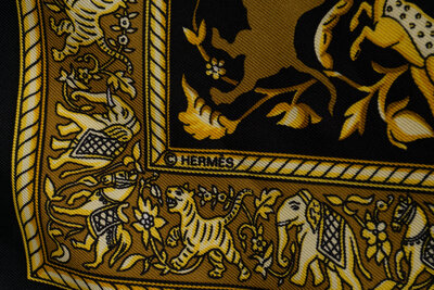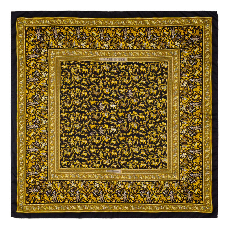"Chasse en Inde" Scarf 90 in Printed Silk Twill with Rolled and Hand-Stitched Edges.