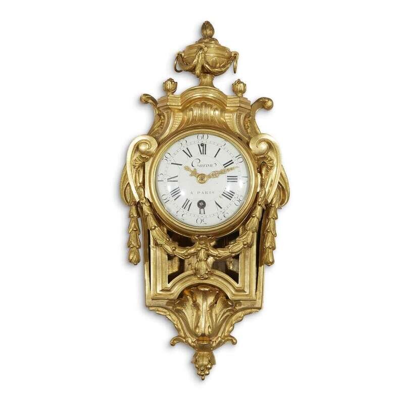 The ormolu case surmounted by a festooned urn and allover decorated with volutes, swags, and strapwork; the enamel dial signed "Caron à Paris" and with both Arabic and Roman numerals; the original works with silk suspension and single bell chime.