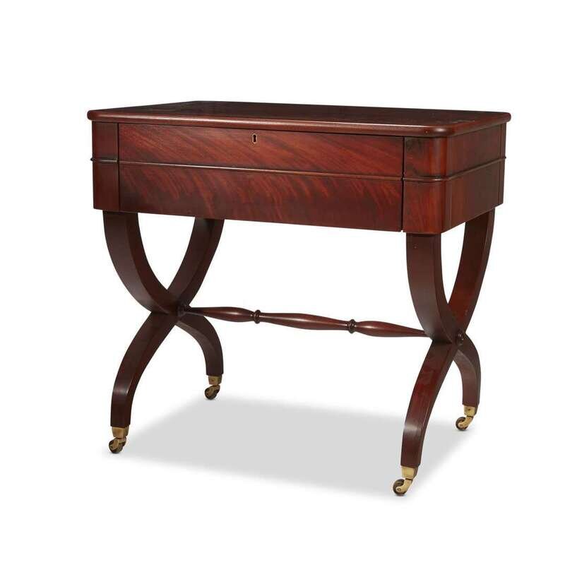 The rectangular top over single frieze drawer raised on two X-form legs with brass casters united by a turned stretcher.