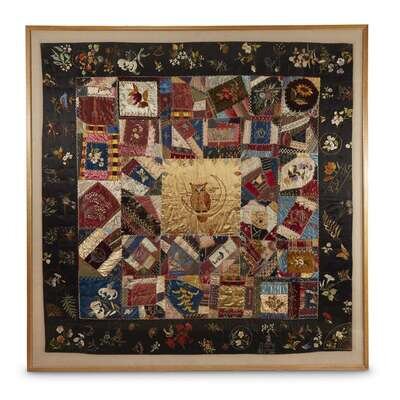 Comprising diverse textile patterns and embroidered figures, birds, plants, flowers, and Japanese motifs, all surrounding a central panel with an owl resting on a moon; presently framed behind plexiglass.