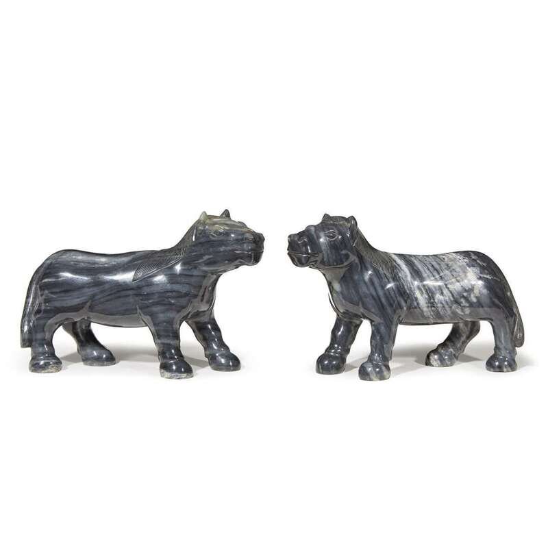 each horse with alert eyes, incised tail and mane, the stone of inky grey color.