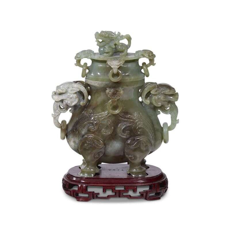 of flattened globular form, sculpted with two connected winged Qilin with strong feet, the lid atopped with a small carved Qilin, the lid and body both adorned with four ringed handles.