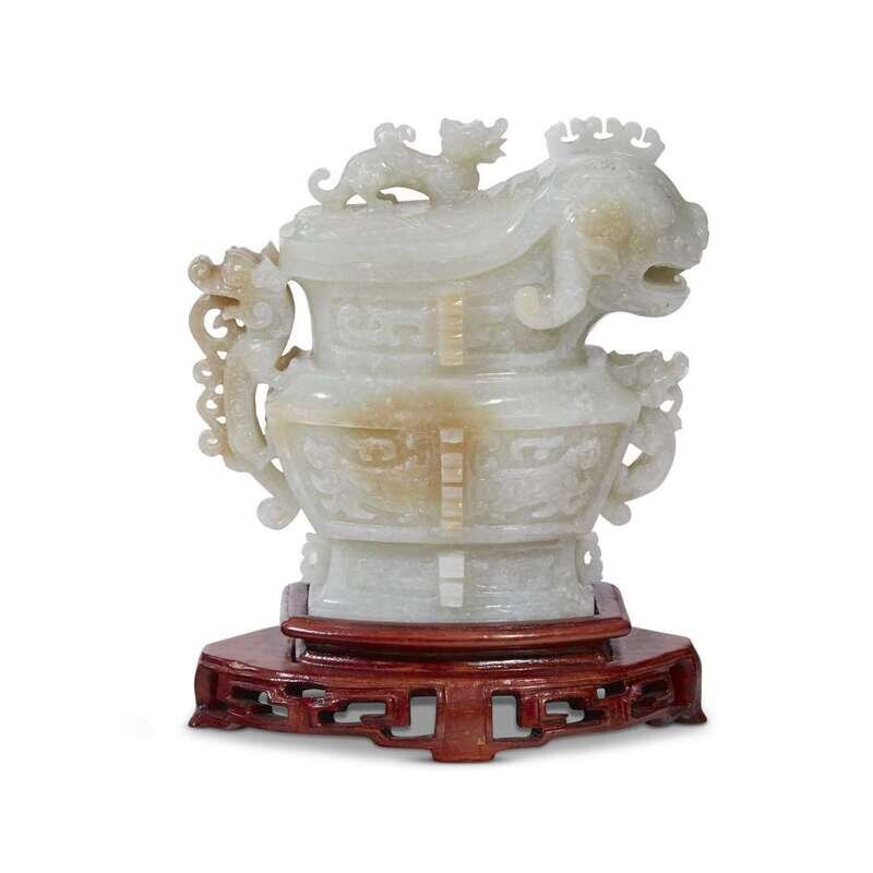 sculpted to show taotie mask designs over body, the vessel formed with chilong handles to front and back, the lid atopped with a winged beast.