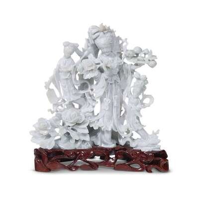 sculpted to show three figurine dressed in flowy robes amidst flowers and flanked by a tall mandora to back.