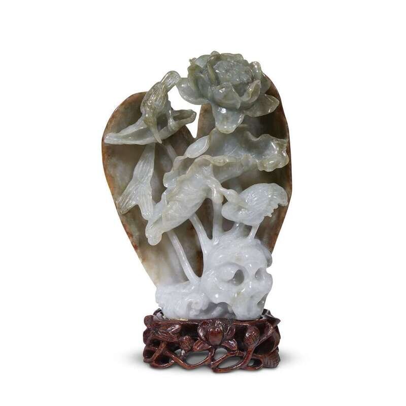 sculpted to show two birds amidst lotus flower and leaves, protruding from an open clam shell.