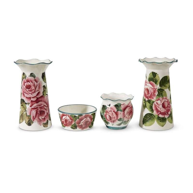 Consisting of two matched vases, a bud vase with flared rim, and a round dish.