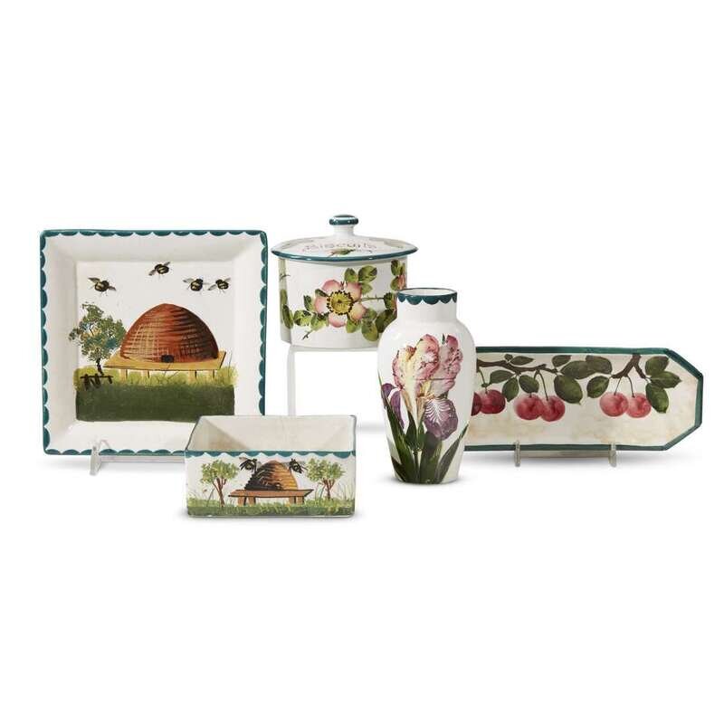 Consisting of a Weymss square dish and plate, narrow bud vase, biscuit cannister, and butter dish.