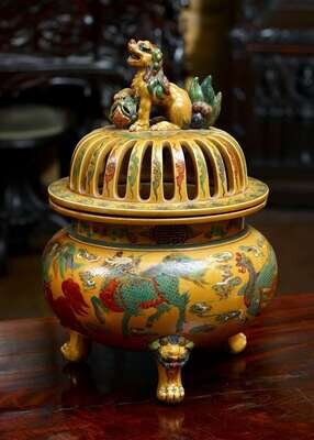 of slightly compressed ovoid form, supported by three stout legs in the form of grimacing beast heads terminating in paw feet, covered overall in a amber glaze, the pierced cover surmounted with a shishi and brocade ball finial, the body decorated with various fabulous birds and beasts, Xuande four-character mark to base. NOW BR2022-046