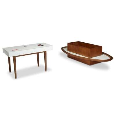 Both with white laminate tops and walnut frames; the side table inset with ceramic tiles. (2).