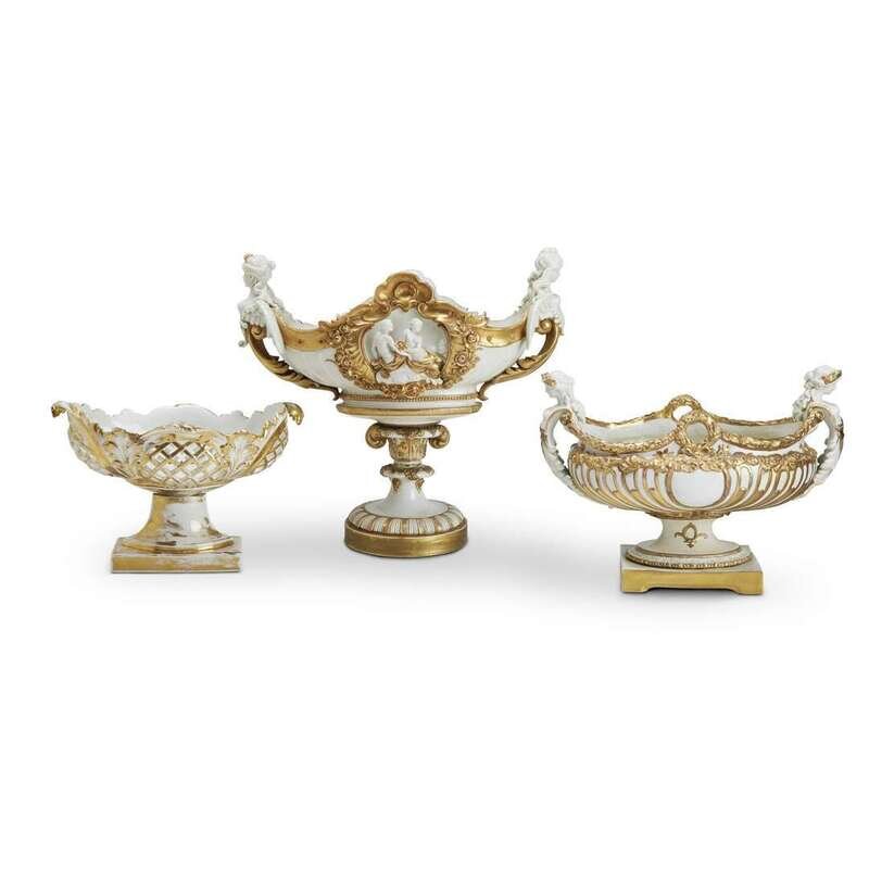 Comprising three centerpiece bowls on stands; two mounted with caryatid-form handles and the third a reticulated basked. (3).