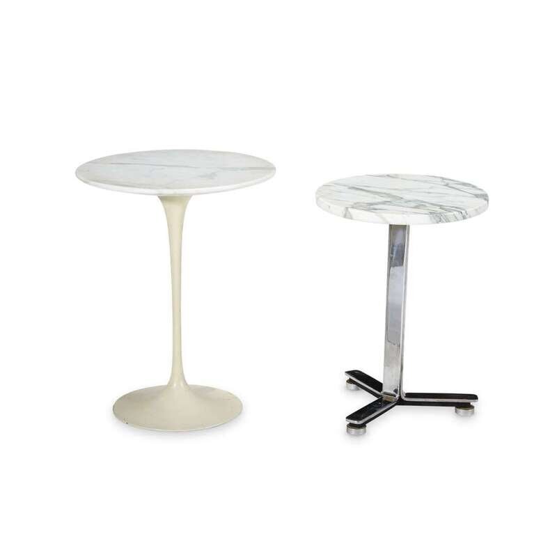 Enameled aluminum, marble Together with a similar chromed steel and marble side table.
